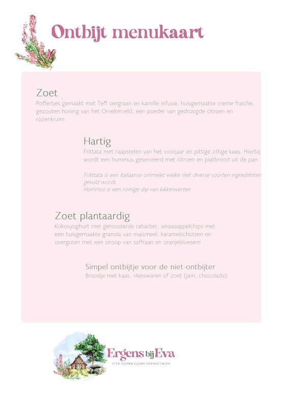 Het overnachten Ergens bij Eva is anders en bijzonder onder andere vanwege het ontbijt. Waarom zijn er lunch- en diner menukaarten maar vindt je zelden een ontbijt menukaart waar met net zo veel aandacht en liefde een mooi ontbijt gerecht voor je wordt neer gezet? Eva doet het graag anders en wil met deze opzet ook een stuk voedselverspilling tegengaan. Zo veel hotels en b&b's werken met buffetten of met een overload aan producten bij het ontbijt waarvan er vaak nog geeneens de helft wordt opgegeten. Hiervan wordt veel weggegooid en dat is natuurlijk zonde!